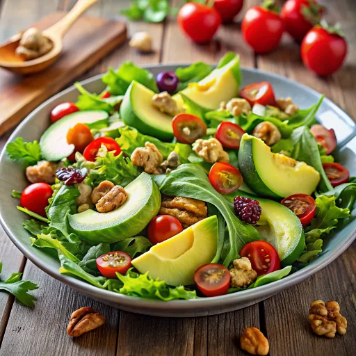 यह ताज़ा और कुरकुरा सलाद अवोकाडो, ताजगी भरी सब्जियों और स्वस्थ अनाजों के मिश्रण से भरा है, जो संपूर्ण भोजन का अनुभव देता है।